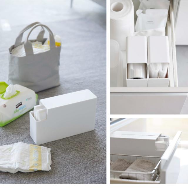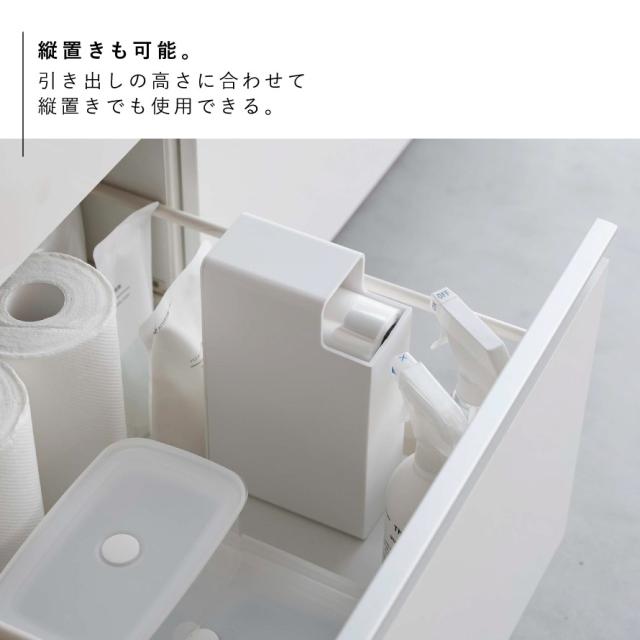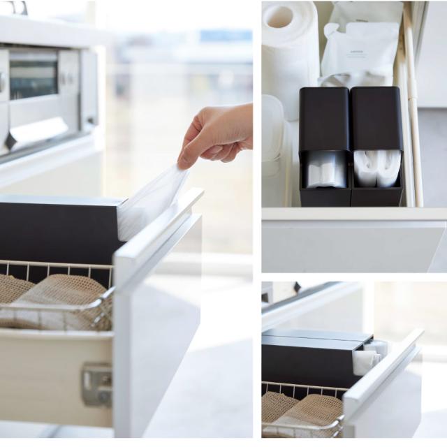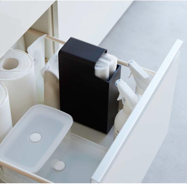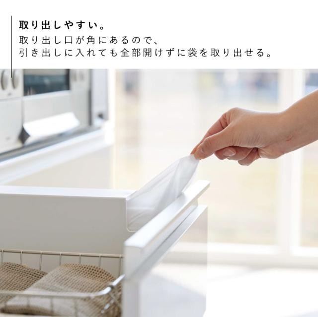 取り出し口が角にあるので、引き出しに設置しても全部開かずに袋を簡単に取り出せます。