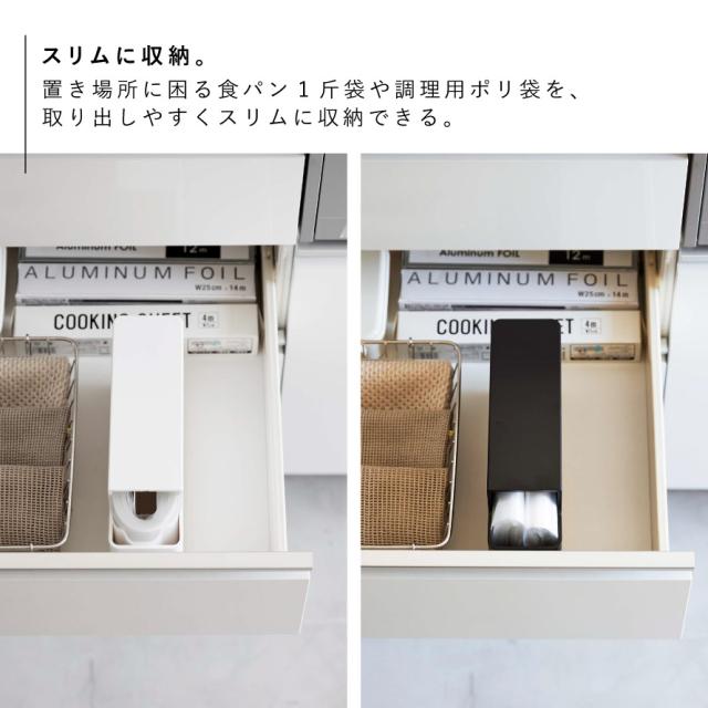 置き場所に困る食パン1斤袋や調理用ポリ袋を、取り出しやすくスリムに収納できるケース。袋を入れ替えて使いやすく、すっきりと収納できるケースです。