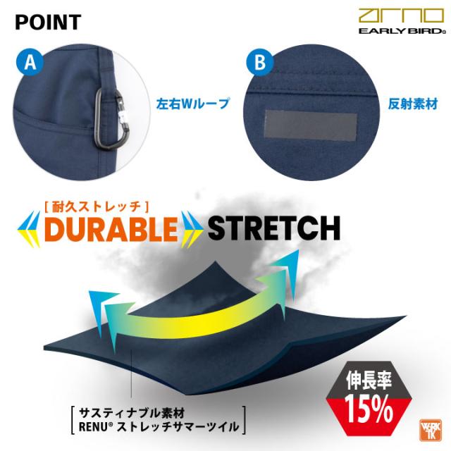 ワークシーンの定番、ポリエステルと綿の耐久ストレッチ素材。