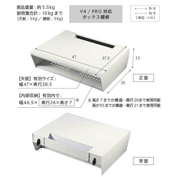 WALLインテリアテレビスタンド V4・PRO対応 ボックス棚板 ■カラー:サテンホワイト ■仕様 本体:スチール ◎完成品 ■サイズ:幅47x奥行37.5x高さ13cm ■重量:約5.5kg ■耐荷重:10kg ※記載は商品仕様の一部です。仕様説明不足等の理由での返品はできません。特に適合等は必ずご確認ください。