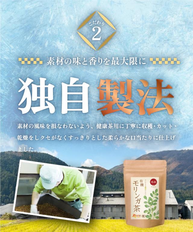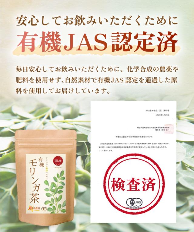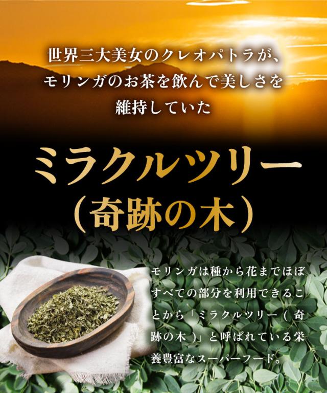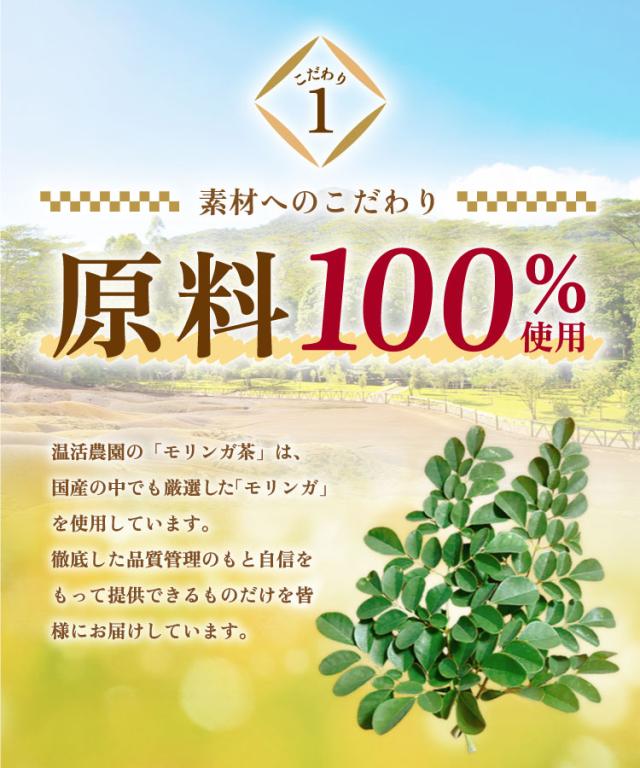 モリンガは種から花までほぼすべての部分を利用できることから「ミラクルツリー ( 奇跡の木 )」と呼ばれている栄養豊富なスーパーフードです。国産の中でも厳選した、モリンガを使用しています。現在、注目を集めている有機モリンガ茶をお楽しみください。