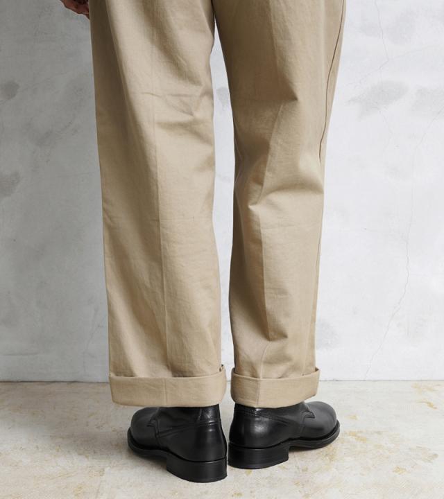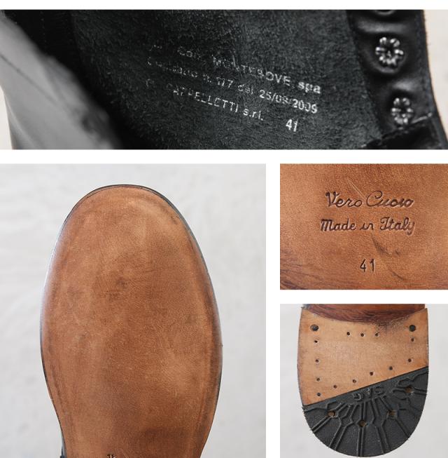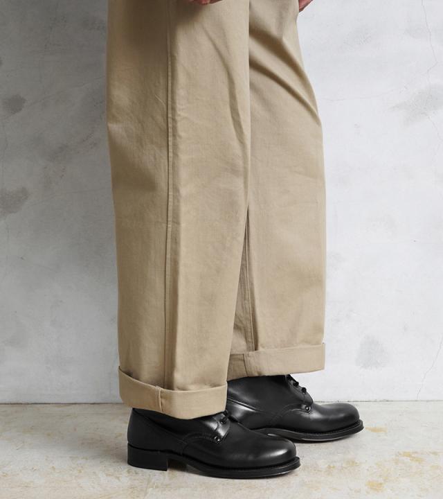 アッパーと同色を使用したシューレース部分のアイレットや、外羽根の付け根に打ち込まれたリベットなどミリタリーらしいディテール。ソールには本革を証明する「VERO CUOIO」が底面に刻印されたレザーを採用しており、履き心地はまるでオフィサーシューズ。