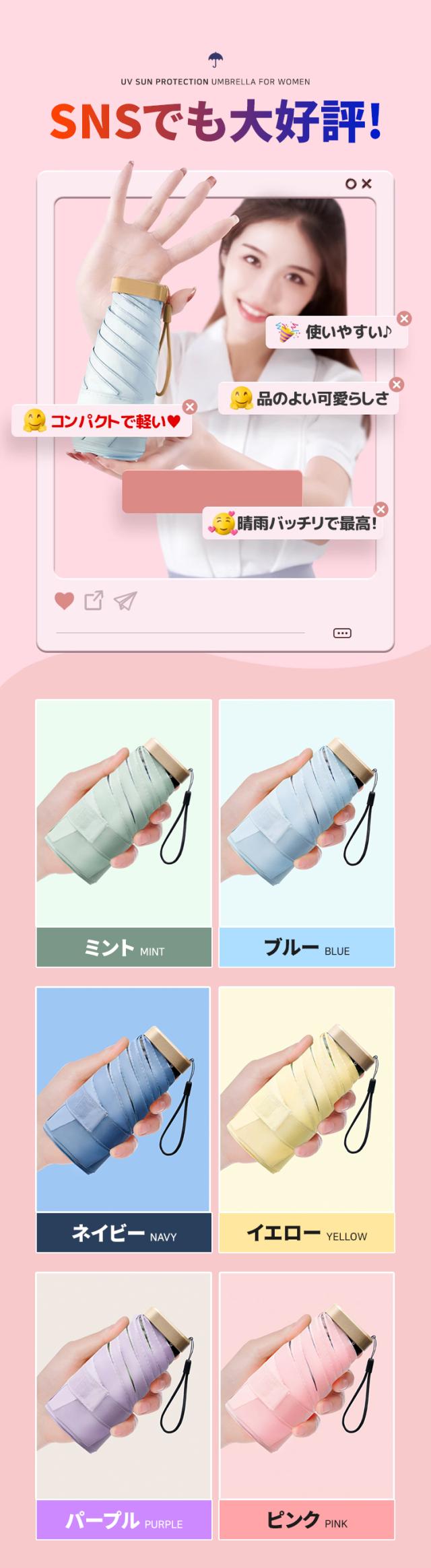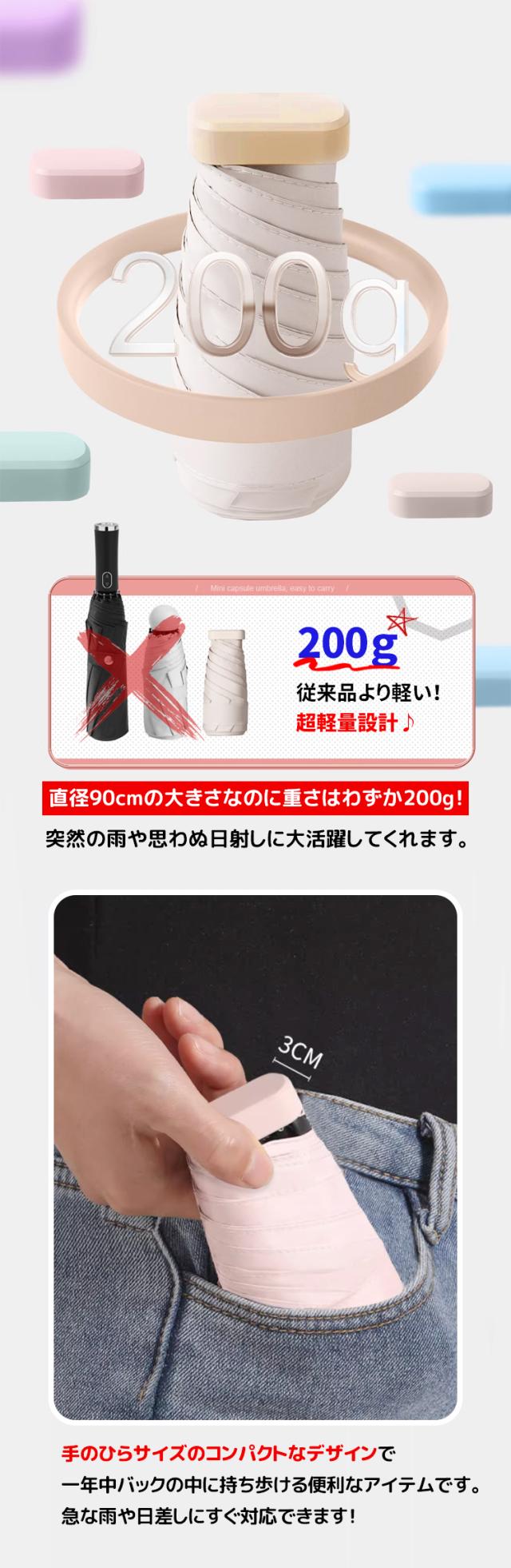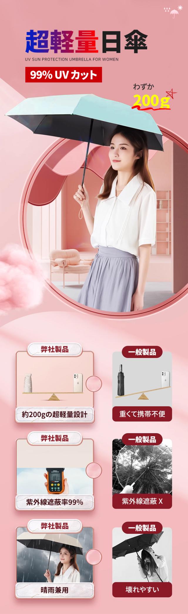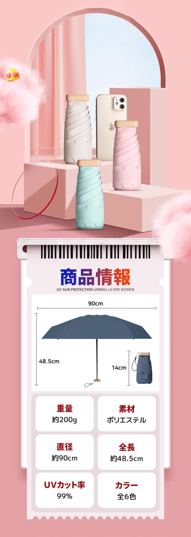 - 色々選択した中からやっと見つけた折りたたみ傘でした。《短所》?広げた瞬間に日差しが傘の中を通る感じで完全遮光とは思えませんでした。傘の中側中心周辺には生地が透き通っている(穴が空いた感じ)箇所が幾つも有りました。 ?折りたたんだ時にまとめるのに時間が掛かります。 ?傘を開く時、柄が中々固定出来ない時が有りました。 《長所》?コンパクトで軽いので持ち易くバックにも楽に収まります。 ?傘の色が素敵でした。