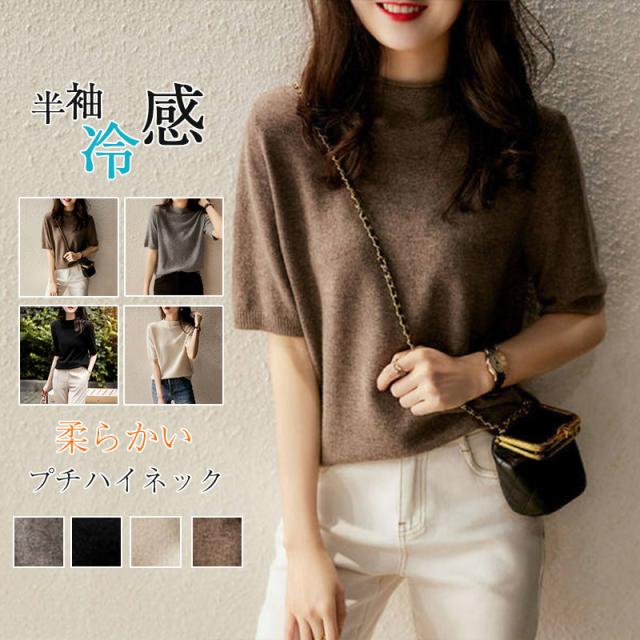 ニット 二の腕カバー 五分袖 半袖 サマーニット プチハイネック トップス 半袖ニット シンプル 涼しい 春夏