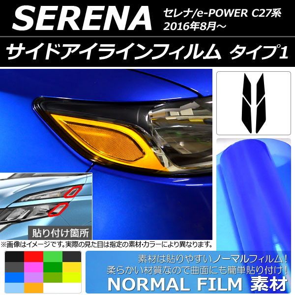 サイドアイラインフィルム ノーマルタイプ タイプ1 ニッサン セレナ/e-POWER C27系 2016年08月〜 選べる14カラー 入数:1セット(4枚) AP-YLNM191 カラー: ブラック レッド ブルー イエロー グリーン オレンジ パープル ピンク マットブラック ライトイエロー ライトグリーン ライトブルー ライトブラック イエローグリーン