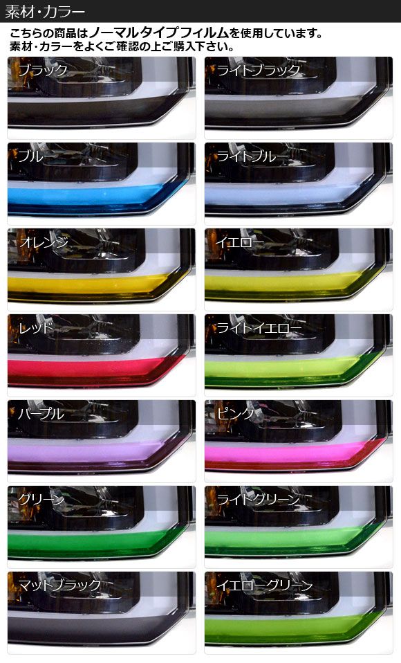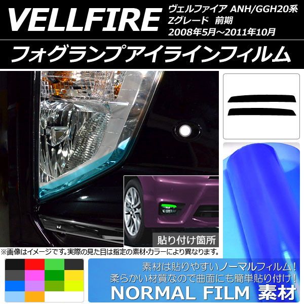フォグランプアイラインフィルム ノーマルタイプ トヨタ ヴェルファイア ANH/GGH20系 Zグレード 前期 選べる14カラー 入数:1セット(2枚) AP-YLNM197 カラー: ブラック レッド ブルー イエロー グリーン オレンジ パープル ピンク マットブラック ライトイエロー ライトグリーン ライトブルー ライトブラック イエローグリーン