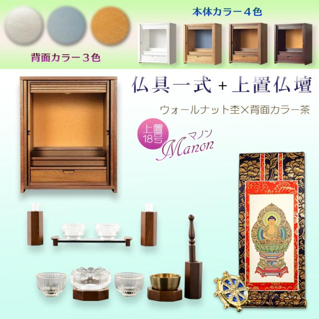 モダン仏壇【省スペース型・スライド式扉:マノン 18号 ウォールナット杢+仏具一式 選べる背面カラー3色】現代調仏壇 モダン仏壇 家具調仏壇 収納扉 スライド扉 仏具一式 仏具 本尊 掛軸 送料無料