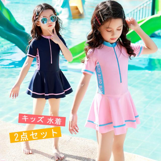 スクール水着 女の子 キッズ 水着 セパレート ショートパンツ ワンピース オールインワン 2点セット シンプル ジュニア ラッシ