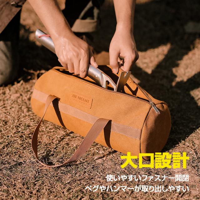 帆布(キャンバス生地)を使用しており、丈夫なつくりで耐久性が高く、ペグハンマーの収納に最適です。