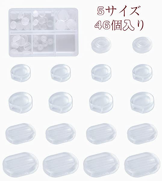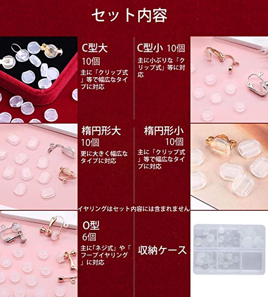 【商品仕様】イヤリングカバー(シリコン製)5種類合計46個セット、C型大/小各10個、楕円型大/小各10個、O型6個、合計46個セットです。収納ケースが付き、イヤリングパーツやちょっとした小物の保管に便利です。