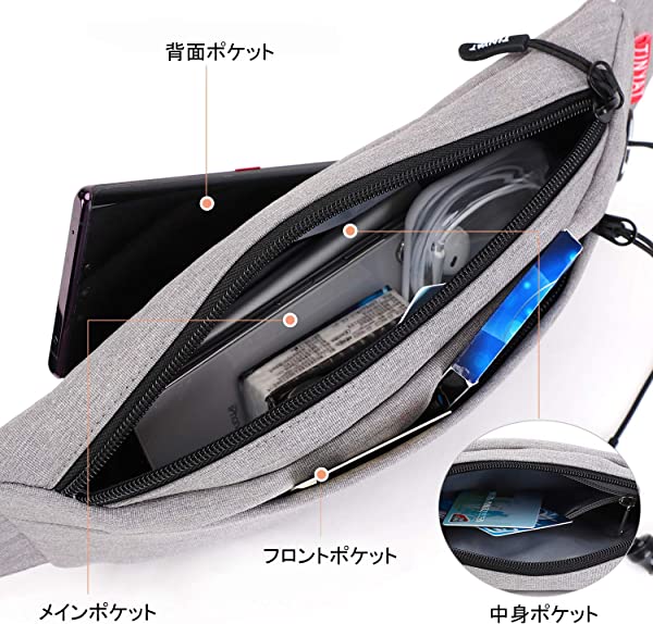 軽量&収納力もバッチリポケットは四つがあります。フロントには鍵、ハンカチを収納でき、メインの部分にはスマホ、イヤホンホール、サングラス、バイルバッテリーを収納でき、中身には隠しポケットを付いて、小銭入れに最適、背面には予備のマスクを入れて余裕です。サイズ:縦12?px横27?pxマチ5?p、重さはわずか150グラムで軽くて普段使いにぴったりです。