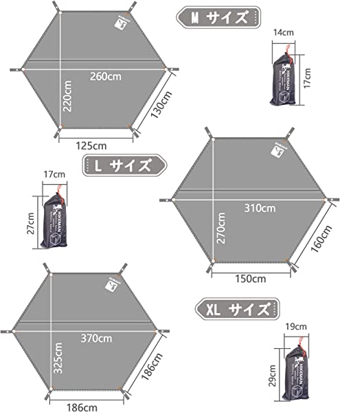 製品仕様:「六角」グランドシートMサイズ:220 260cm Lサイズ:270 310cm 材質:210Dオックスフォードクロス生地 付属品:合金アルミペグ 6本+収納袋 六角形なので、テントのグランドシートとして、特にワンポールテントにぴったりの形状です