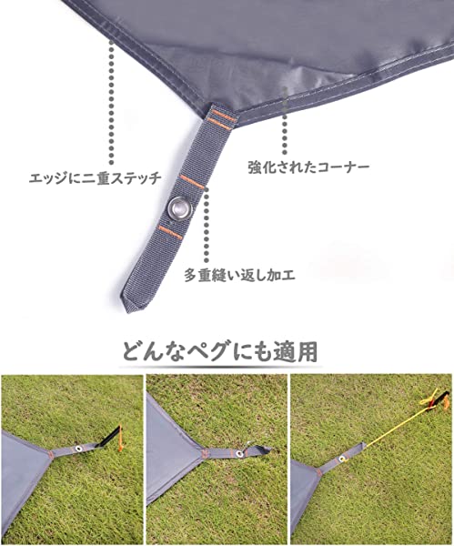 多用途:テントシートの各角に金属ハトメがあります。ロープや2つのポールを使用することでフライシート、ハンモックのカバー、日陰/雨の天幕タープなどを簡単に設置することができます。さらに、広い面積を確保した軽量レジャーシートです、数人一緒に使られます