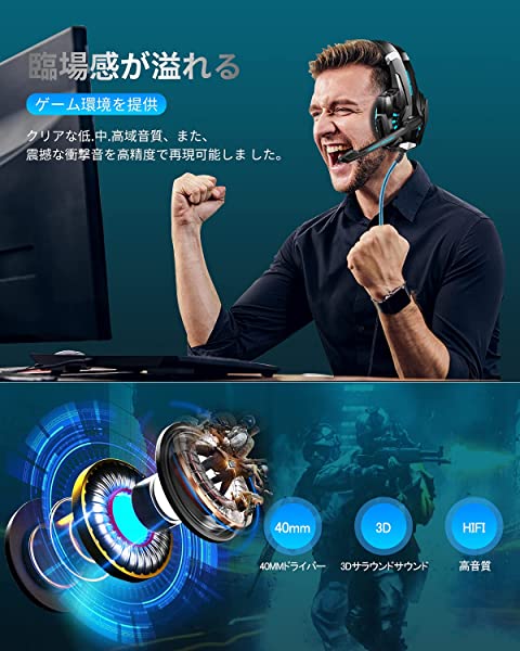 ■【臨場感が溢れるゲーム体験】■ ゲーミング ヘッドホンの内蔵40mmオーディオドライバーは、鮮やかな音場、音の鮮明さ、衝撃感を得ながら、立体的な臨場感が溢れる音を忠実に再現、まるで自分がゲームの中に入り込んでいるかのような没入感を得ながら、チームの指示なども明確に聞き取ることができます。正確に敵の足音を聞き取り、位置や動きを敵より早く察知することで勝利を手にしよう!ゲームだけでなく、映画、音楽、ボイスチャット、ラジオ、録音なども最高!