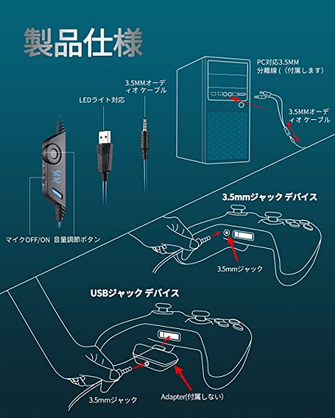 ■【有線モード&優れた互換性】■有線ゲーミングヘッドセット機能では、ゲーム用に特別に設計されています。 これは、PS4、Xbox One、PC、Nintendo Switchなどの3.5mmインターフェイスを備えたプロのゲーミングヘッドセットに適しています。 ケーブルを接続すると、ゲームでクリアでパワフルなベースステレオサラウンドサウンドを楽しめます。注意事項:旧型Xbox Oneに接続する場合は別途Microsoft Adapter(本機には付属していません)が必要となります。