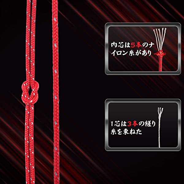 高品質&材質:4mm反射ガイロープの内芯は100 %ナイロンで作られた、表地はポリエステルで作られた。外皮と内芯に異なる素材を使用することで、耐摩耗性と引っ張り強度を増強して、内芯(1芯はもっと細い糸3つがある)ナイロンで413KGの重さを耐えます