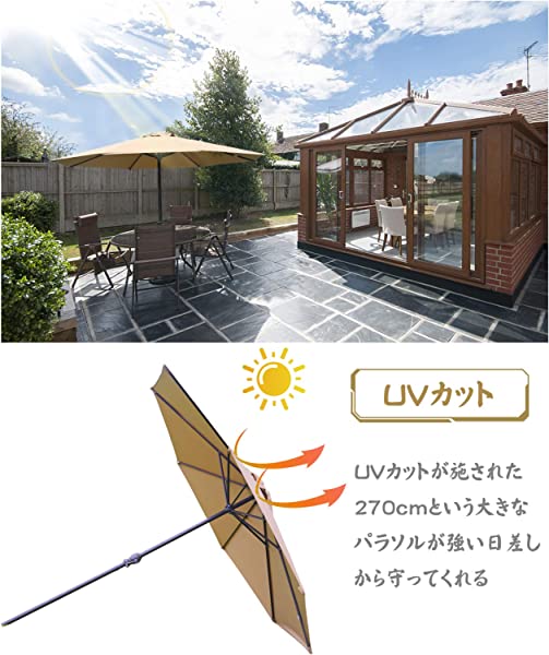 uvカット:UVカットが施された270cmという大型パラソルが強い日差しから守ってくれるので、直射日光を気にせず快適にガーデンライフを楽しんでいただけます