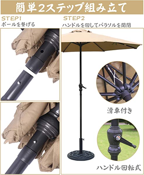 ハンドル回転式:パラソルの開閉には、普通の傘とは違いハンドル式を採用、クルクルと回すだけで開閉できるので、これほど大きなパラソルでも女性一人で簡単に開閉できます