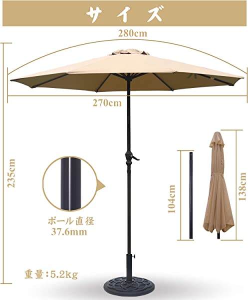 大型サイズ:大型サイズの270cmタイプは、国内最大級の大きさ!広範囲をガードすることができるので、友達とのバーベーキューや会食など大人数で過ごす方にお勧めです