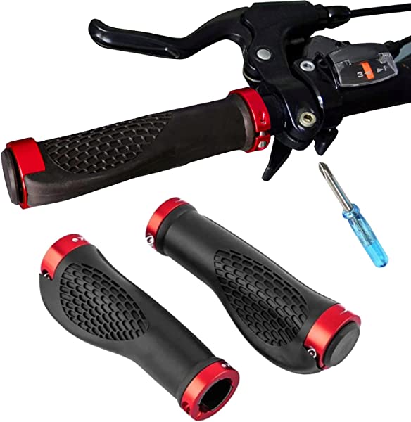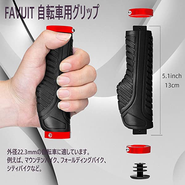 自転車グリップカバー ハンドルバー ラバー 人間工学ハンドルグリップ ゴム製 アルミロックリング付き エンドキャップ付き 耐震 耐久性 滑り止め BMX/折りたたみ自転車/スポーツ自転車 /ロードバイク/クロスバイク/マウンテンバイク用 内径22.2mm 取付工具付き 1ペア 左右セット (レッド)