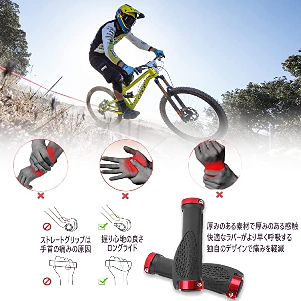 【人間工学に基づいた設計】このハンドルグリップは人間工学に基づいて設計され、手とハンドルグリップの接触面を広げ、 手、手首、肘などの疲労を最小限にし、長時間走行中でも快適です。親指に近い内側は細めにして握りやすく、手の平と接する外側は広めにして手にかかる圧力を分散。ハンドルグリップの表面は数多くの小さい穴があり、滑り止めや汚れ防止や耐摩耗の機能があります。表面のエンボス加工により通気性も確保されています。
