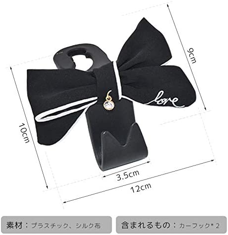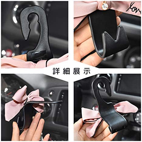 商品の説明: 製品名:リボン形のカーフック 材質:プラスチック、ミルク布 サイズ:フックの幅3.5cm 長さ10cm リボンのサイズ9cm 12cm 色:ブラック 特徴: 1.最大荷重能力20kg 背もたれフィットデザイン。