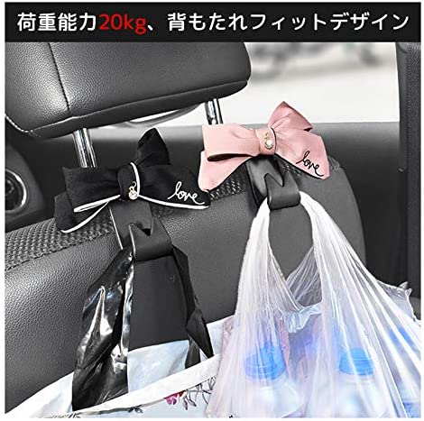 車用収納 バックシート カーシート フック バックフック リボン 車 可愛い 取り外し不要 通用型 耐荷重20kg 汎用 荷物掛け 2個セット(ブラック)