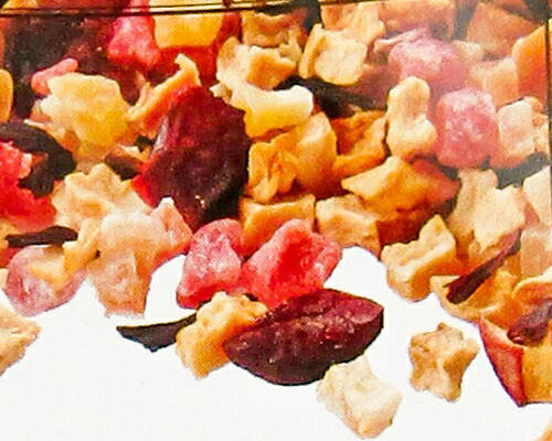 | 加糖ドライストロベリー(タイ製造)、有機ドライアップル、加糖ドライクランベリー、加糖ドライパパイヤ、加糖ドライマンゴー、有機ハイビスカス/香料、クエン酸、保存料(亜硫酸塩)、着色料(赤40) |