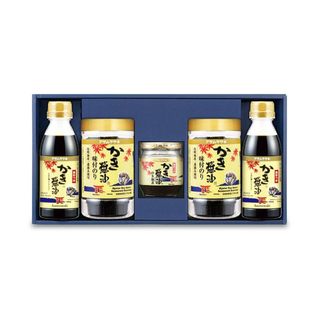 | ・かき醤油(300ml×2本) ・かき醤油味付のり(8切30枚×2個) ・かき醤油のり佃煮(150g×1個) |