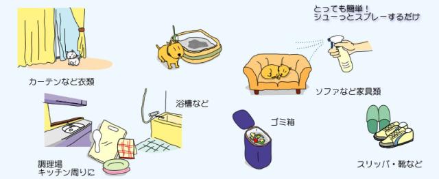 排泄物臭(便臭・尿臭)はもちろんのこと、肛門嚢分泌物臭や腐敗臭そしてタバコや生ゴミ、生活臭・カビ臭、靴・スリッパや絨毯・カーテン・ふとん等についた臭いまで瞬時に消臭できます。