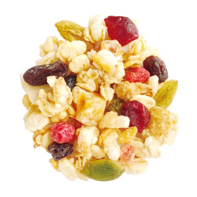 5種類のシリアルと9種類のフルーツとナッツをブレンドし、ふわっとしたかろやかな新食感のフルーツグラノーラです。