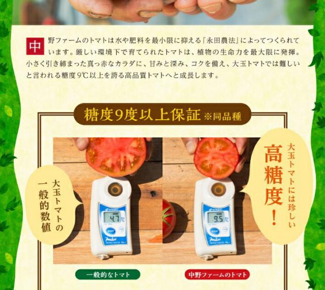 トマトを生産する中野ファームは、北海道余市町の丘陵地帯に位置しています。余市町は気温の寒暖差が大きい為、農作物の糖度が高くなるという優位な気候に恵まれています。さらに中野ファームのトマトは日本海からそよぐミネラルをたっぷり含んだ潮風、水はけのよい赤土、水平線へと姿を隠すまで延々と降りそそぐ太陽の光、トマトにとって絶妙な自然条件のなかで育っています。"少量でも高品質"のトマトを念頭に、中野ファームでは20年以上に渡ってトマトを栽培しています。