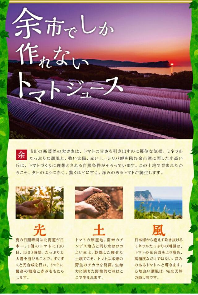 海から風が吹き抜ける、北海道余市町の小高い丘でつくられた真っ赤なトマト。強い太陽と潮風の中で鍛え上げられたトマトは、深い甘みと清々しい酸味が、小ぶりなカラダの中にぎっしりと詰まっています。そんなトマトを使用した「余市SUNSET」は甘みと酸味のバランスが抜群!一度飲んだら忘れられない濃厚トマトジュースです。