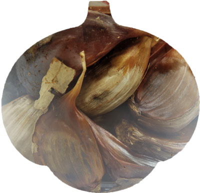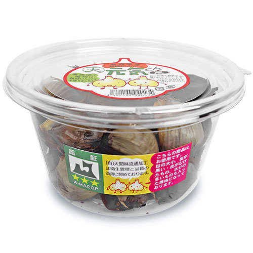原材料は青森県産のにんにく100%のみを使用し、温度と湿度(にんにくの持つ水分のみ)調整だけで約1 ヶ月間熟成することで、果肉は真っ黒く、独特の甘酸っぱい味と香りへと変わった「熟成黒にんにく」です。真空処理で食後の臭いがマイルドです。