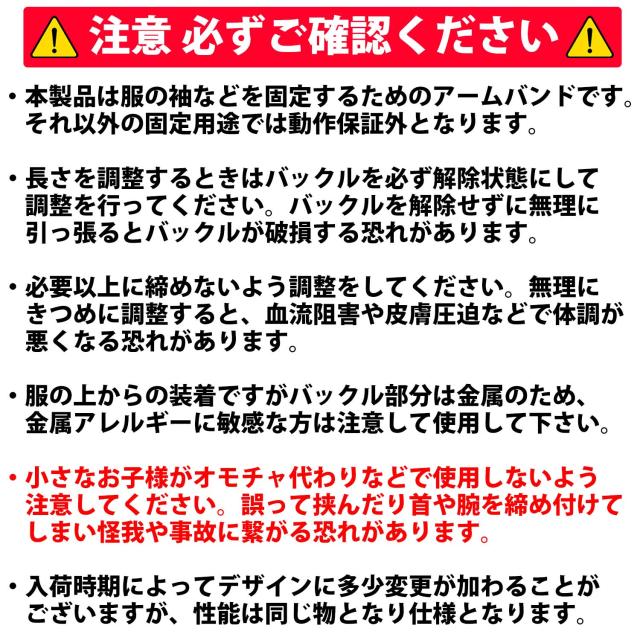 ・本製品は服の袖などを固定するためのアームバンドです。それ以外の固定用途では動作保証外となります。