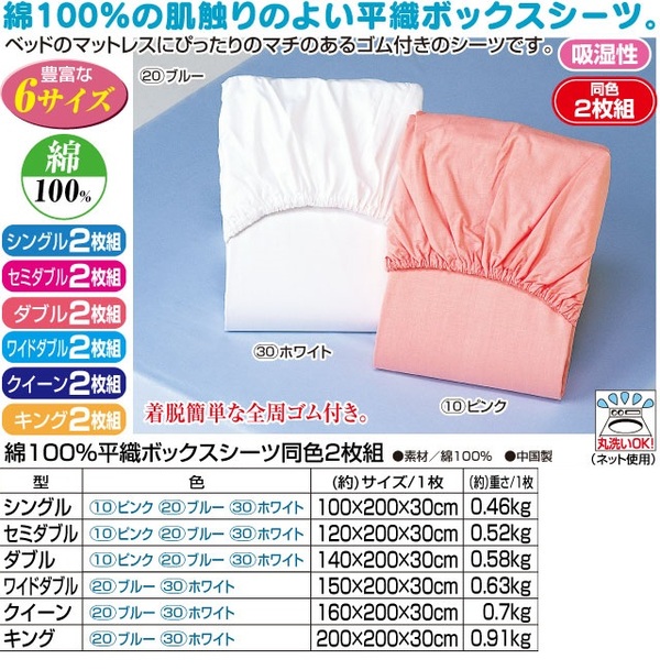 綿100%の肌触りの良い平織りボックスシーツマチは全周ゴム付き。