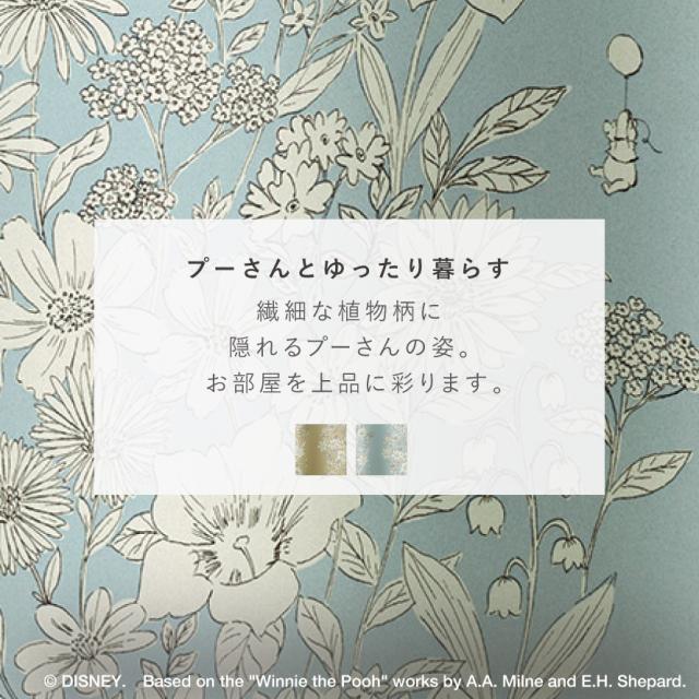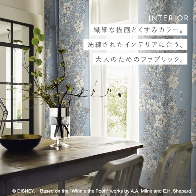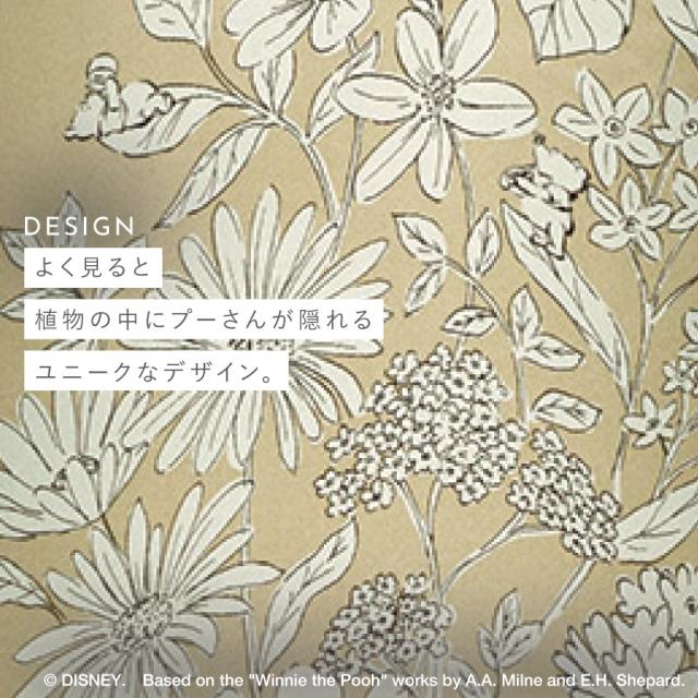 繊細で美しい植物柄の中にプーさんが隠れている、大人可愛いドレープカーテン。ワントーンカラーで、インテリアにも馴染むデザインです。