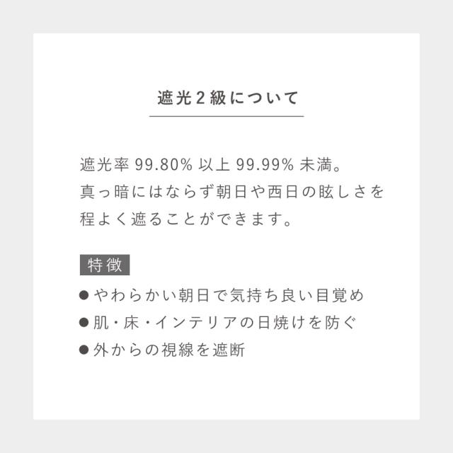 遮光2級(遮光率99.80%以上99.99%未満)で真っ暗にはならず、朝日や西日のまぶしさを程よく遮ることができます。朝日をやんわりと浴びて、自然な光に。肌やフローリング、家具の日焼け、外からの気になる視線を遮断します。