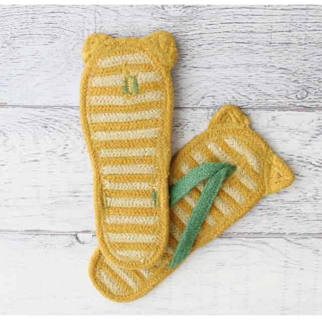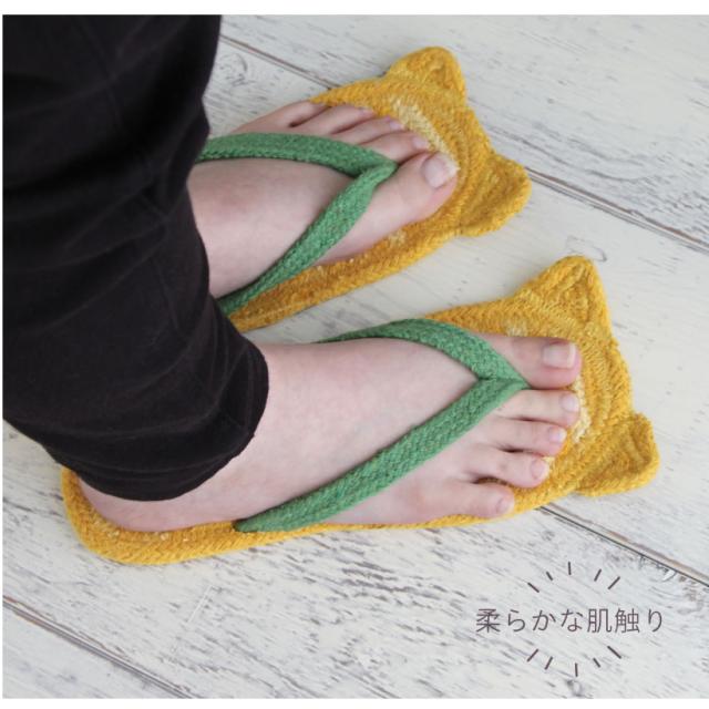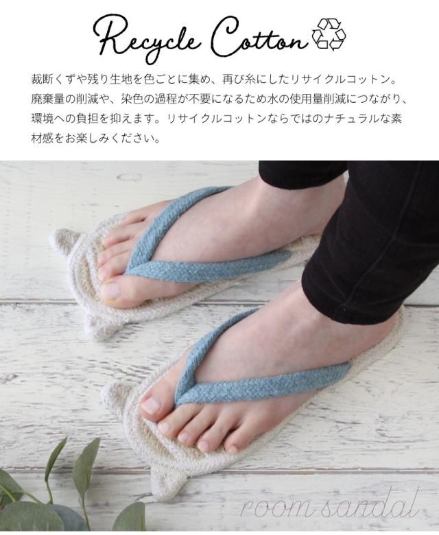 ちょこんと飛び出た耳がキュートな動物モチーフのリサイクルコットンサンダル。リサイクルコットンを使用することで環境への負担を抑え、柔らかな肌触りです。素足でフローリングを歩くとペタペタするのが気になる・・・そんな時にオススメです。