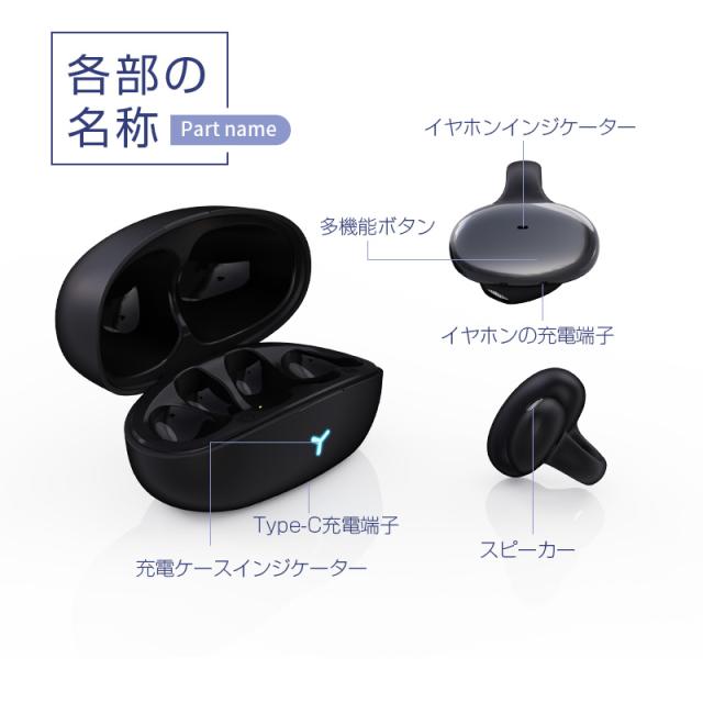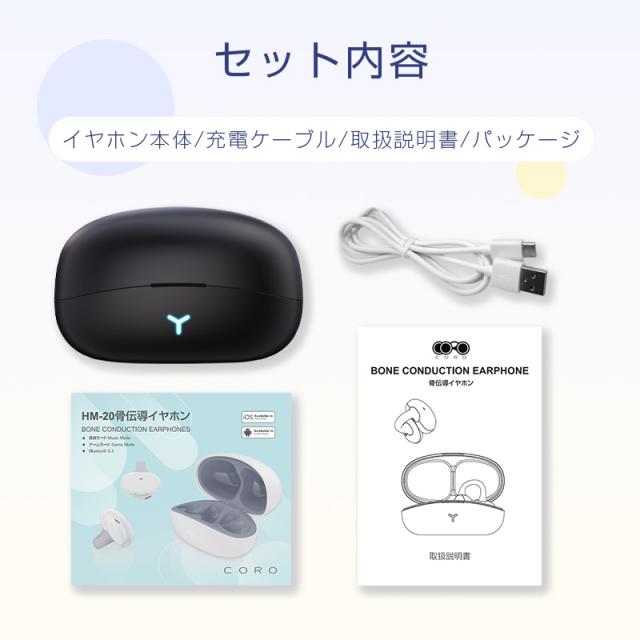 【パッケージリスト】骨伝導イヤホン本体、Type-C充電ケーブル、日本語取扱説明書。