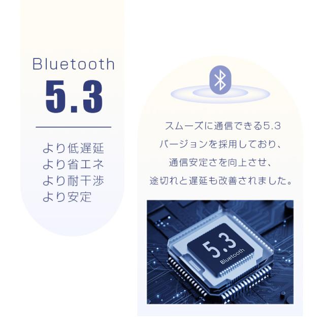 【最新Bluetooth5.3】本製品には接続範囲、接続安定性やデータ伝送速度などが大幅に向上したBluetoothバージョン5.3を採用しており、従来の通信問題、音飛び、途切れ、遅延の状況などを幅広く改善されました。