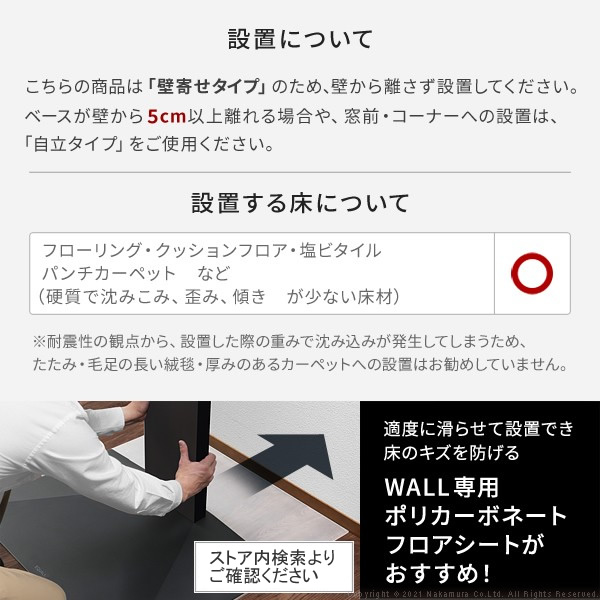 【グッドデザイン賞受賞】WALL INTERIOR TV STAND V2 HIGH TYPE( WALLインテリアテレビスタンドV2 ハイタイプ) ウォールナット ■カラー: ウォールナット ■本体素材:スチール ■サイズ 対応テレビサイズ:60インチ(40kg相当)まで 幅70x奥行52x高さ129〜169cm 重量:約20.5kg 高さ調節ピッチ:5cm(9段階) ベースサイズ:幅70x奥行52(45.5)cm・厚み15mm ■備考:お客様組立品 ※お客様組立て品につきましては、組み立て後に不良の連絡をされても対応ができません。 組み立て前にパーツに不良・傷等がないか、必ずご確認下さいます様よろしくお願い申し上げます。 ※記載は商品仕様の一部です。仕様説明不足等の理由での返品はできません。特に適合等は必ずご確認ください。