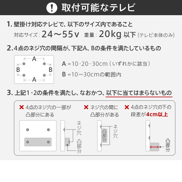 対応テレビサイズ:24インチ~55インチ(20kg相当)まで