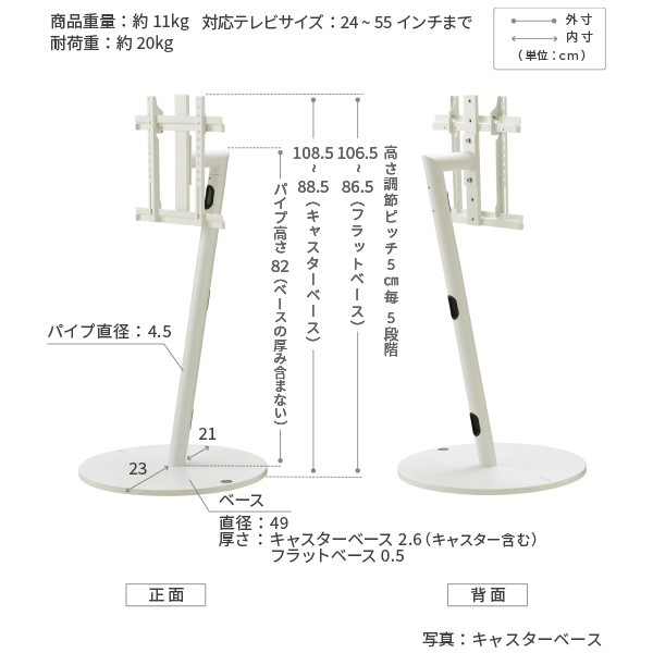 WALL INTERIOR TV STAND A2 LOW TYPE(WALLインテリアテレビスタンドA2 ロータイプ) フラットベース サテンホワイト ■カラー サテンホワイト ■ベースバリエーション フラットベース ■本体素材:スチール 粉体塗装 ■サイズ 対応テレビサイズ:24インチ~55インチ(20kg相当)まで 重量:約11kg 高さ調節ピッチ:5cm(5段階) 本体サイズ:幅49x奥行49x高さ86.5〜106.5cm ベースサイズ:直径49cm・厚み5mm ■備考 お客様組立品 ※お客様組立て品につきましては、組み立て後に不良の連絡をされても対応ができません。 組み立て前にパーツに不良・傷等がないか、必ずご確認下さいます様よろしくお願い申し上げます。 ※記載は商品仕様の一部です。仕様説明不足等の理由での返品はできません。特に適合等は必ずご確認ください。