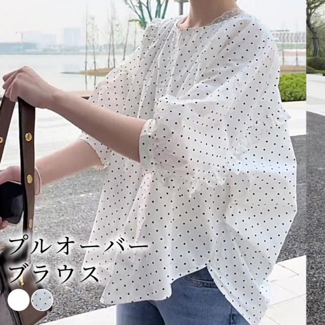 春新作 ブラウス レディース 七分袖 プルオーバー 無地 ドット おしゃれ きれいめ かわいい 白 春夏 トップス シャツ ラウンドネック パフスリーブ ネックリボン 切り替え フリル バックシャン 通勤 OL 通学 カジュアル シンプル ナチュラル