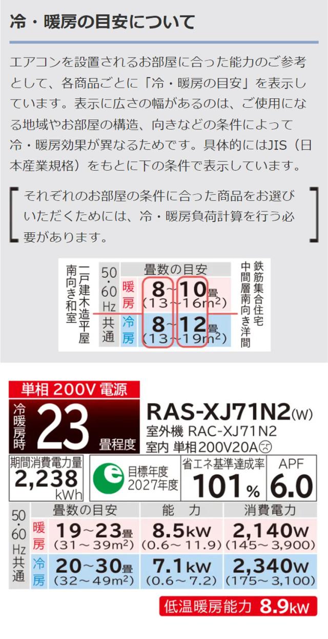 | RAS-XJ22N/6畳 | RAS-XJ25N/8畳 | RAS-XJ28N/10畳 | RAS-XJ36N/12畳 |
