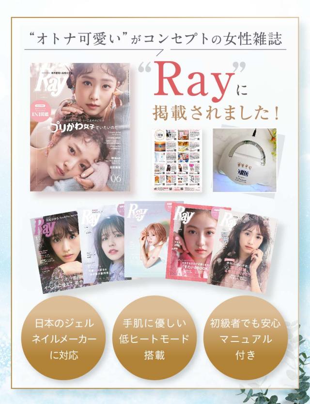 大人可愛いがコンゼプトの女性ファッション誌Rayに当店の商品が掲載されました!!シリーズ累計3,000万台突破!!1台で素敵にジェルネイルが楽しめるRENAGE LED/UVライトがついに販売開始しました!