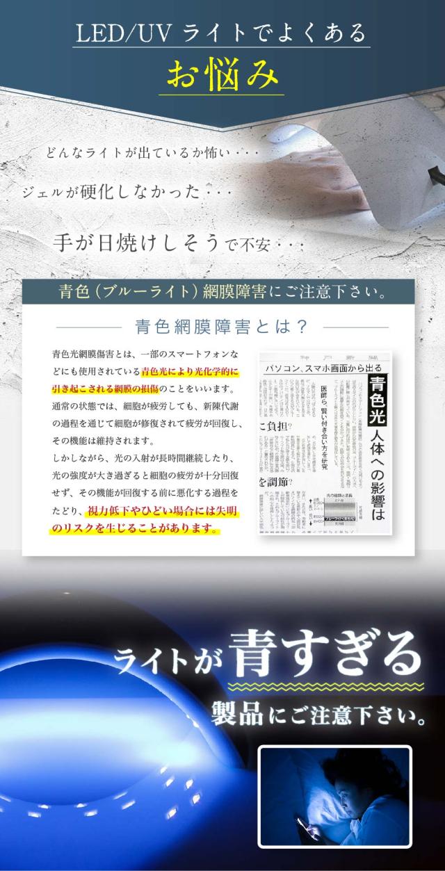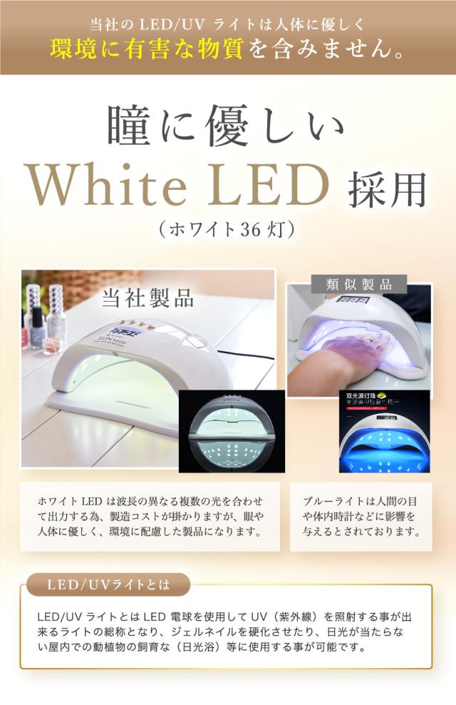 ネイルライトでよくあるお悩みNo.1は「どんなライトが出ているか不安・・・。」です。当店のネイルライトは瞳に優しいWhiteLEDを採用しており、UVライトの波長域についても計測済みになりますので安心してお使い頂けます!