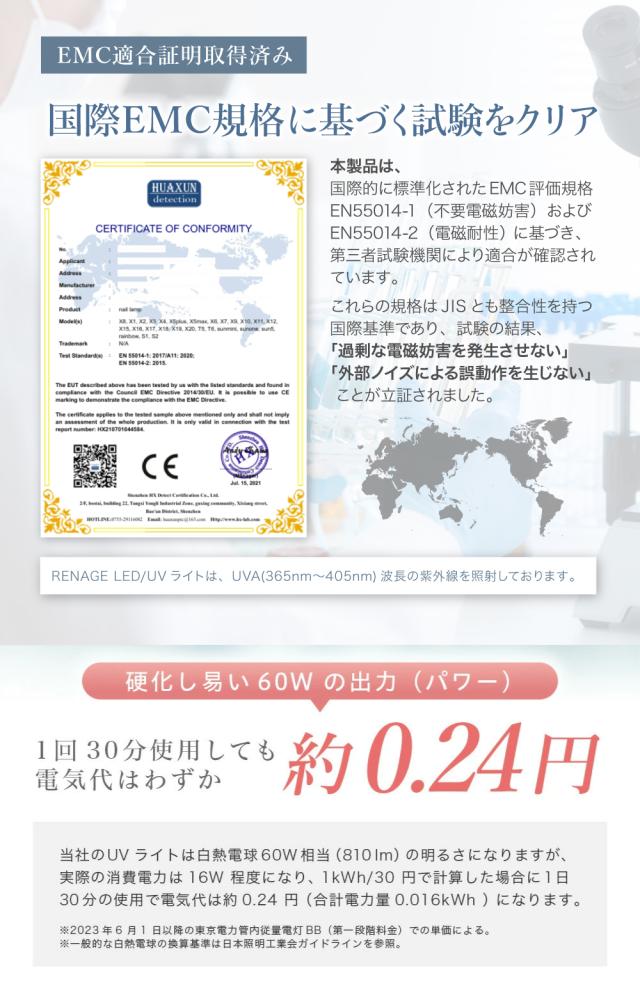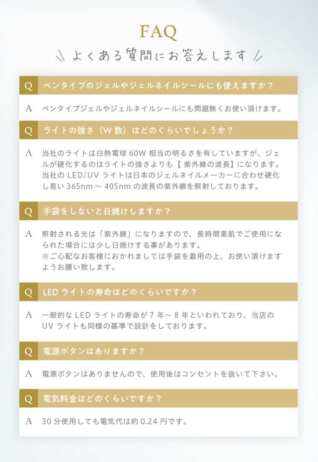 A.当社のライトは白熱電球60W相当の明るさを有していますが、ジェルが硬化するのはライトの強さよりも「紫外線の波長域」になります。当社のLED/UVライトは日本のジェルネイルメーカーに合わせ硬化し易い365nm〜405nmの波長の紫外線を照射しております。
