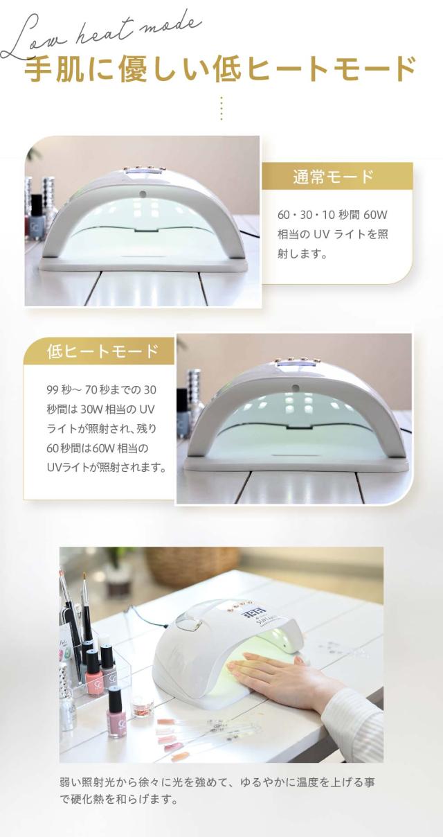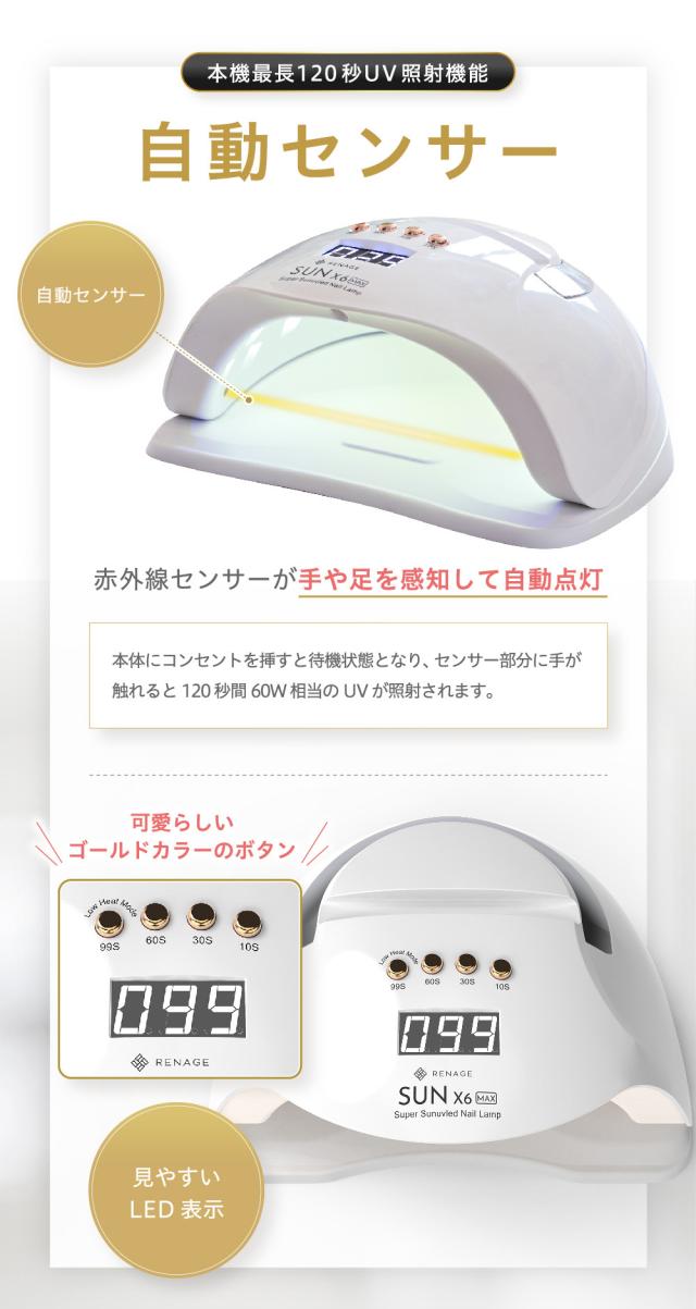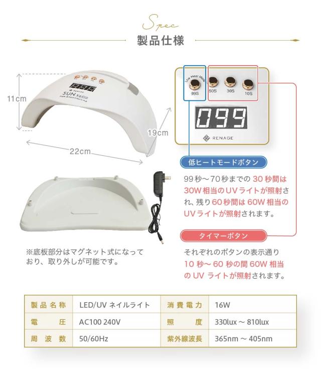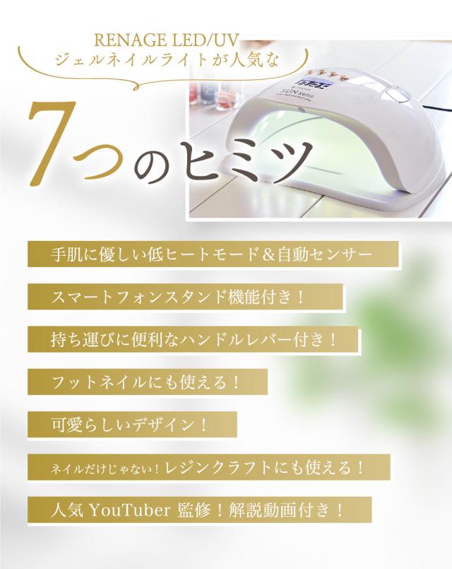 ネイルサロンで施術したような輝く指先を実現してみませんか?RENAGE LED/UVライトは60Wのハイパワーモードと30Wの低ヒートモードの2つのモードを使い分ける事で硬化熱を和らげ手への負担を軽減します。